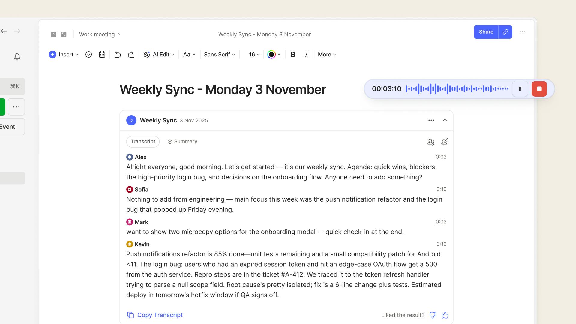 Automatically turn recordings into meeting notes. AI Meeting Notes transcribes your audio, summarizes the key points, and recognizes speakers so you can assign names and keep everything clear.