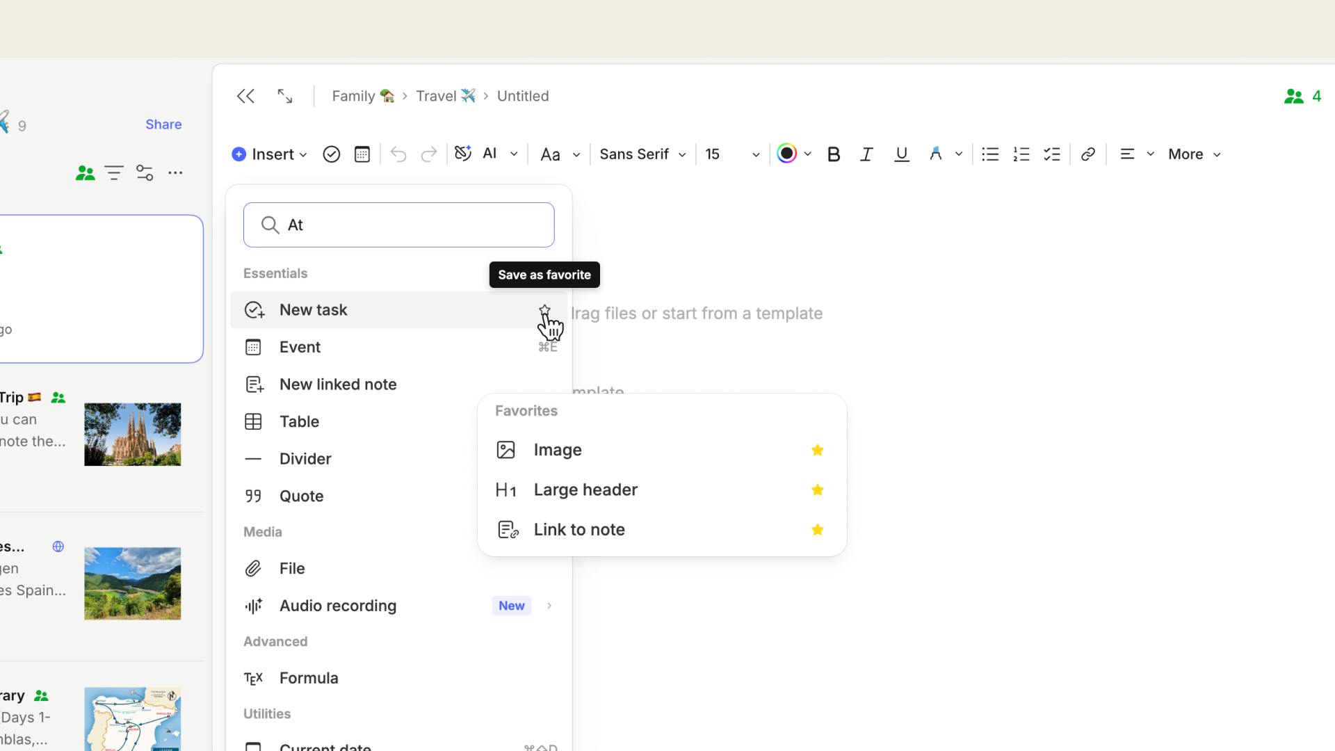 You can now search for items in the Insert menu on both Mobile and Desktop, and pin your favorite tools to the top of the list by tapping the ⭐. You can also insert text styles and list items directly into your notes.