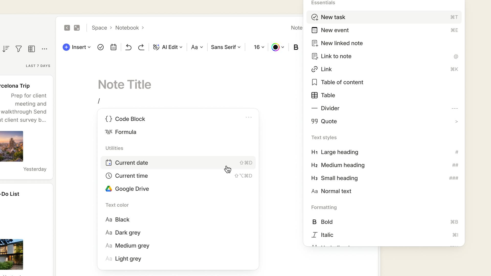 After making slash commands easier to use, we expanded what you can do with them. We added 16 new options to speed up note-taking while typing, including dynamic date mentions (@Today), Google Calendar events, audio recordings, and more formatting tools.