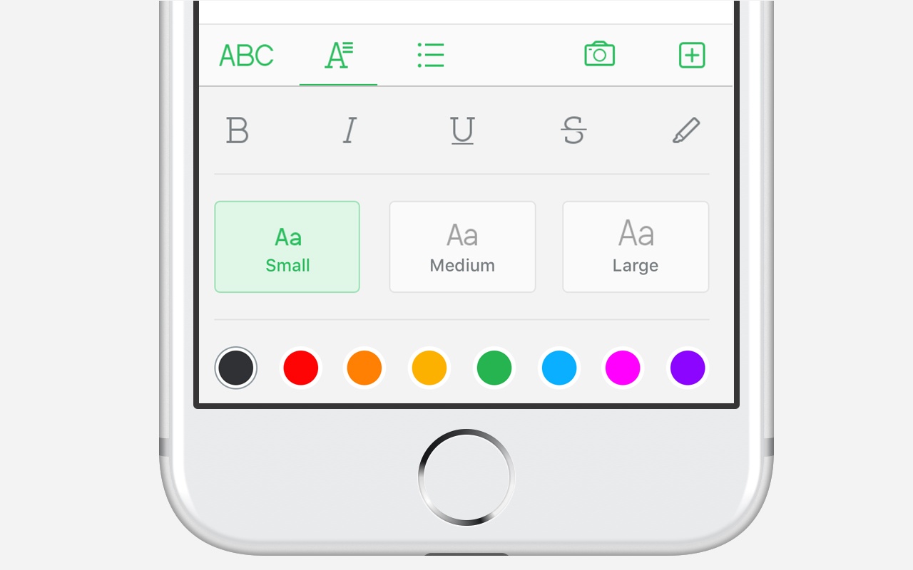 Sometimes, plain black text isn’t enough. Evernote 8.0 gives you more ways to style your text. Use different colors and sizes to create headers and subheaders, call attention to key points, or make it easier to recall information. We make it easy by offering several pre-defined text colors and font sizes for you to choose from.