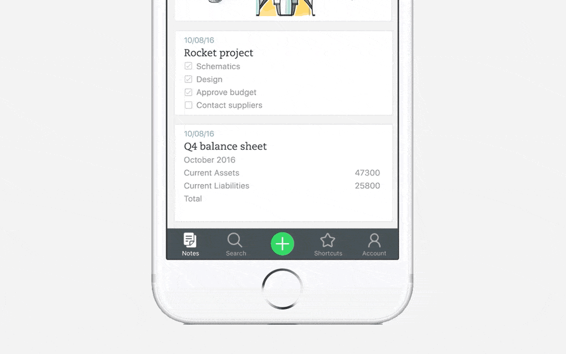Note-taking should be simple, so we simplified it. Open Evernote and tap the green ‘plus sign’ button to create a new text note. Long press this same button and slide your finger to record audio, capture images (such as business cards, whiteboards, and receipts), and set up notifications to remind you to take action on a particular note.
