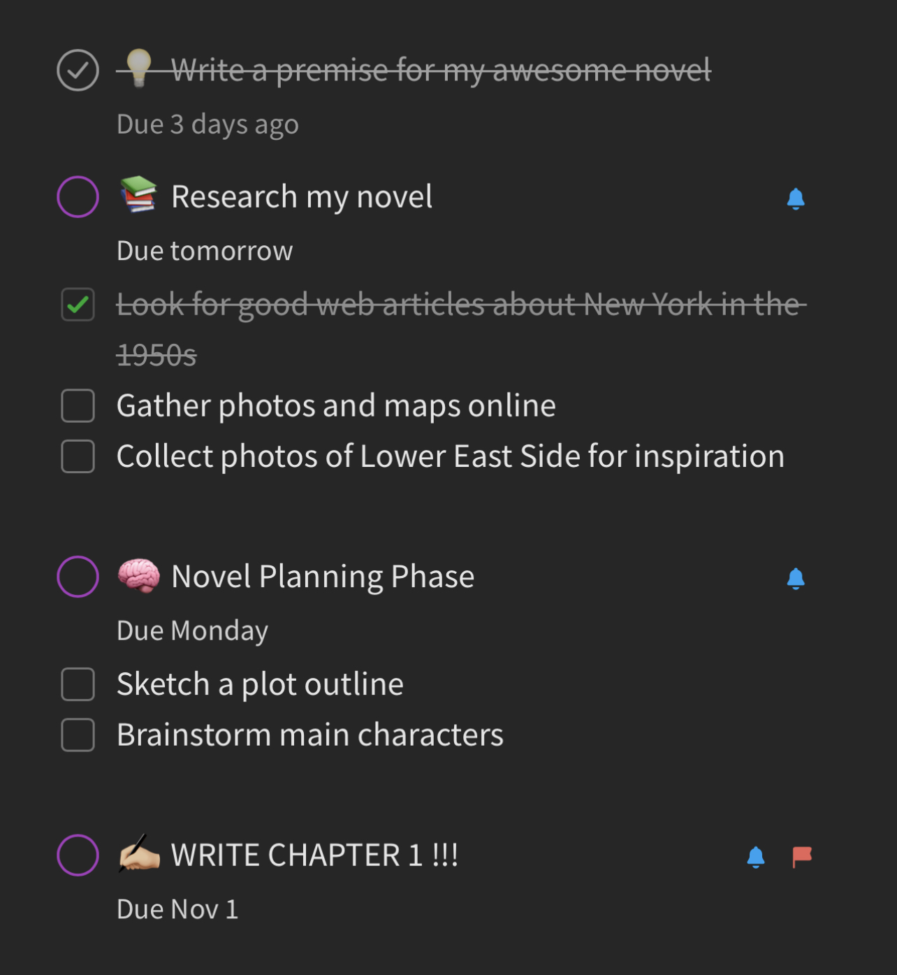 However you like to plan, tasks and checklists in Evernote are your friend. Instead of living in their own app, disconnected from the rest of your project, Evernote’s tasks live inside your notes, right next to the information you need to get started. You can even combine tasks and checklists, assigning deadlines to your important milestones while tracking every step on the path to your book.