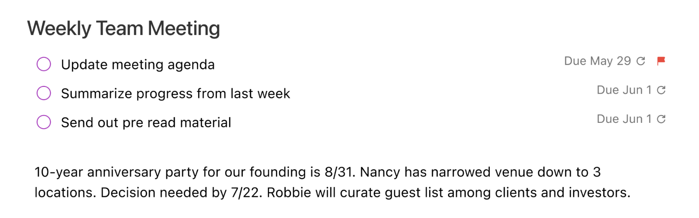 Let’s say your goal is to improve the efficiency of your team’s weekly meeting. To make sure you always come prepared, create a recurring task to update the agenda and summarize the team’s progress. You can schedule a reminder to work on this task two days before the meeting, and set the due date for one day before your meeting, so you have time to get it done and your team has time to review in advance. This recurring task can live directly in your weekly meeting notes, so your note is easily accessible when it comes time to prepare each week.