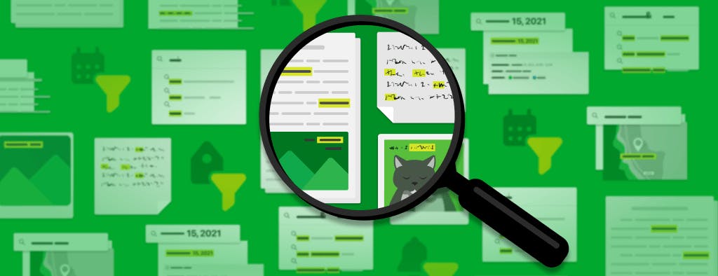 厳密には、検索方法ではありませんが、Evernote では保存した画像、手書きメモ、添付ファイルの中も検索できます。ですから、たとえばブレインストーミングでアイデアを書き出したホワイトボードの写真を撮って Evernote に保存しておけば、そこに書かれた文字を後から簡単に検索できます。あるいは、新規顧客の名刺を写真に撮って保存しておけば、必要なときに電話番号やメールアドレスがすぐに見つかります。PDF やドキュメントも、文書内に含まれた語句を使って簡単に見つけられます。特別な検索構文や演算子は必要ありません。