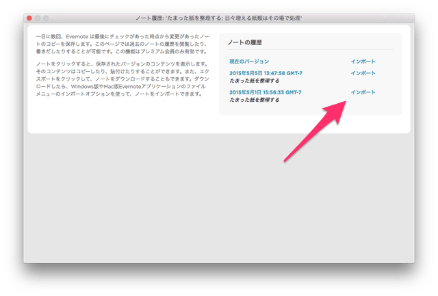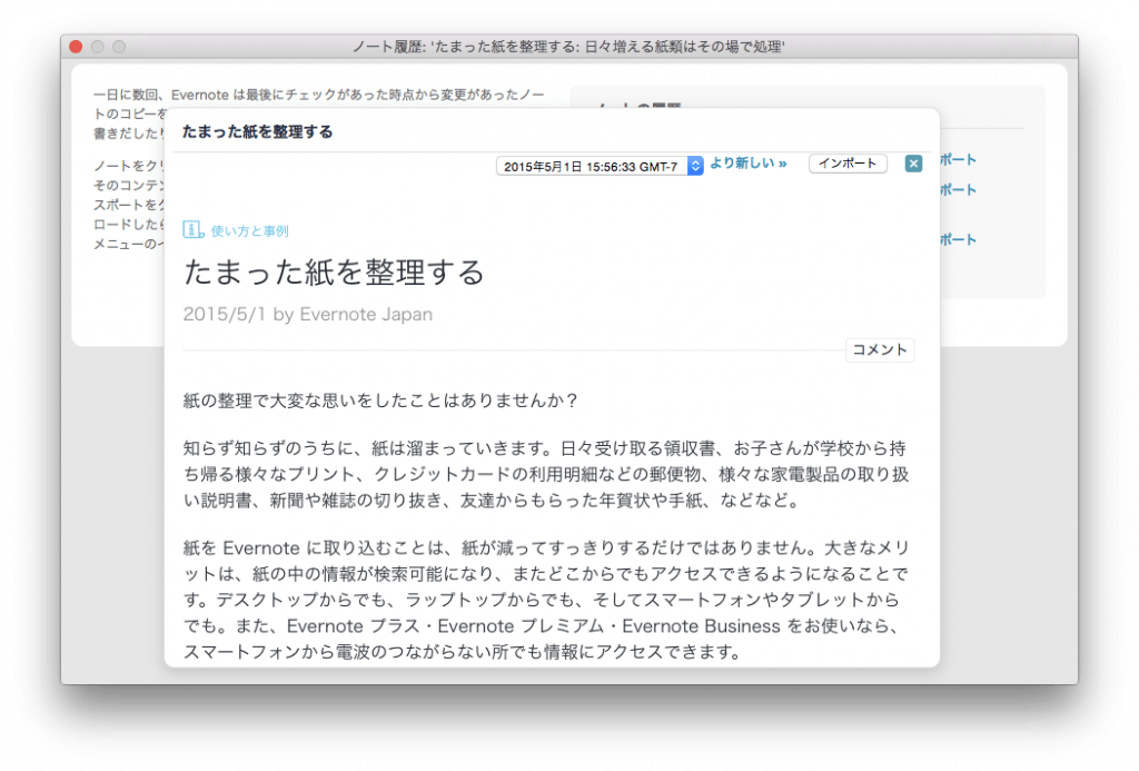 元の内容をコピーして今のノートにペーストすることもできますが、Mac 版・ Windows 版では、戻したいバージョンをインポートする方法もあります。