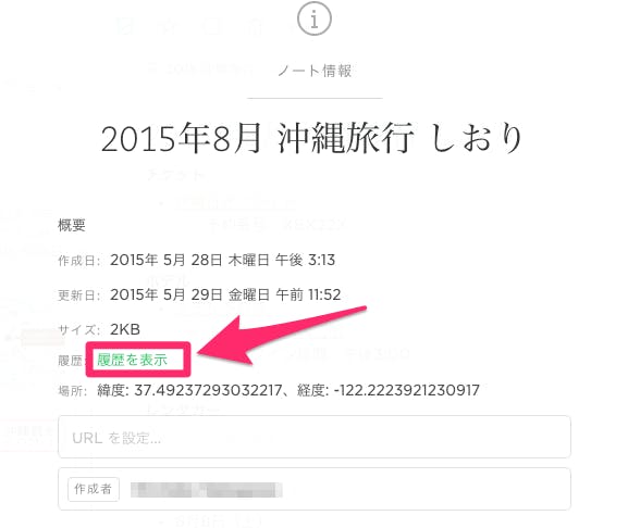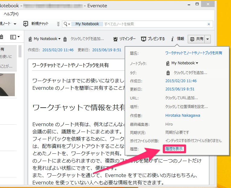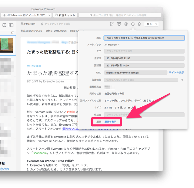 Evernote プレミアムアカウントでは「ノートの履歴」セクションで以前のバージョンのノートを閲覧できます。Mac 版、Windows 版、あるいは Web 版の Evernote で該当のノートを開き、「i」(情報)アイコンをクリックして「履歴を表示」をクリックして下さい。