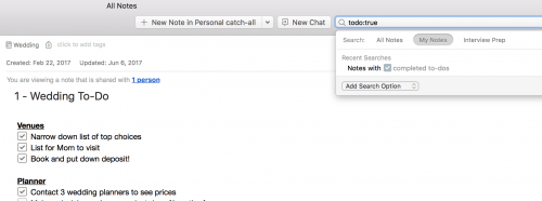 • Busca todo:false para ver todas tus notas con tareas pendientes incompletas, una forma fácil de ver lo que queda pendiente por hacer en tus listas de tareas.