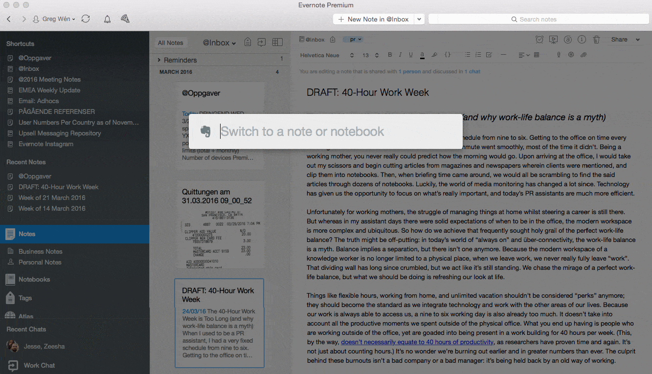 • ¿Necesitas acceder rápidamente a una nota, libreta o etiqueta concreta? Utiliza Cmd + J con Evernote para Mac o Ctrl + Q para Windows para “saltar” a ella rápidamente. Pruébalo, inmediatamente comprobarás por qué este atajo es uno de los preferidos.