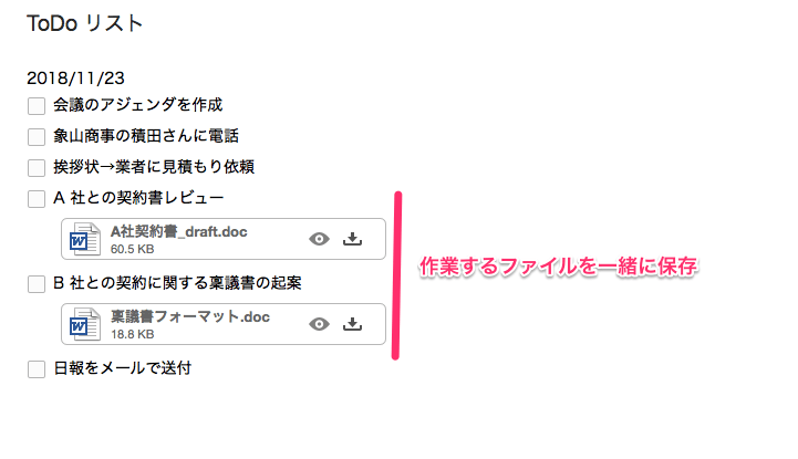 毎日必ず使うのはタスクリスト。朝、電車の中でスマホから「今日やること」をチェックリストにして書き出し、仕事中はパソコンで同じノートを見ながら、終わったらチェックを入れていきます。また、タスクに関連するファイルがあったら一緒に保存しておくのがおすすめ。「やること」と「作業用のファイル」がセットになるので、すぐに作業に着手できます。