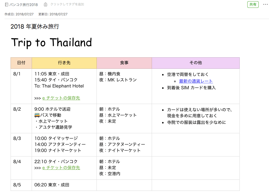 表の機能を使って旅程表を作ること。特に、「航空券とホテルだけ取って、あとは自由行動!」というタイプの方にはすごくおすすめです。こんな感じでぜひ作ってみてください。