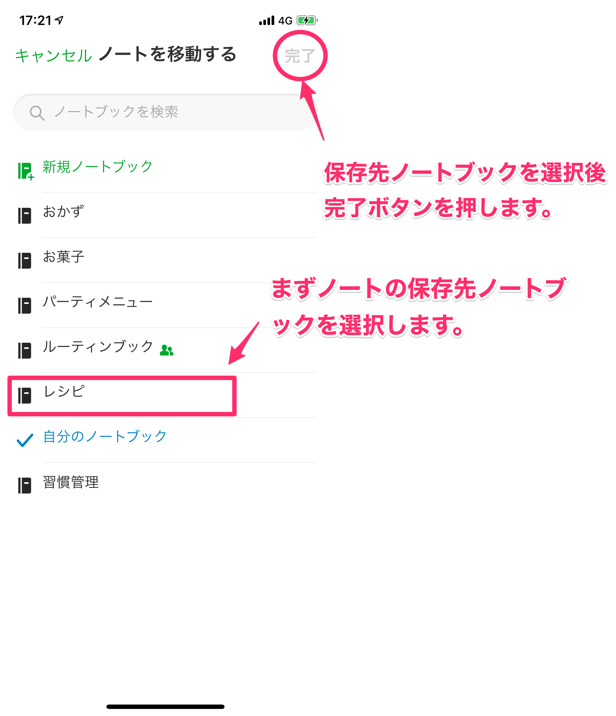 作成したノートが保存されているノートブックは各ノートの左上に表示されています。保存先のノートブックを変更したい場合、ノートの右上にあるメニューボタン(点線アイコン)→「ノートを移動する」を選び、移動先のノートを指定することで可能となります。またノート画面の左上に表示されているノートブック名をタップすることでも可能です。