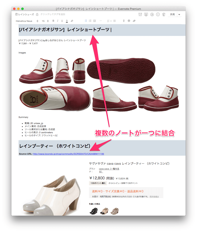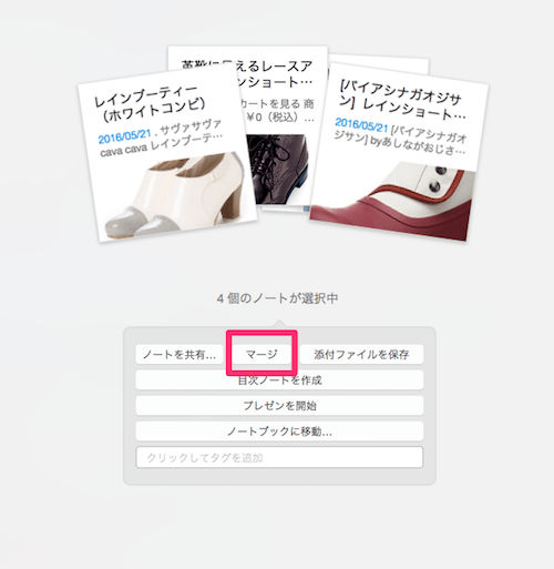 複数のノートに分かれて保存されている情報を、ひとつのノートとしてまとめてしまうこともできます。お気に入りのレインシューズだけを選んで、ひとまとめにしてみましょう。複数ノートを見る手間がなくなります。該当のノートを複数選択し、画面右欄に表示されたメニューの中から「マージ」を選択します。