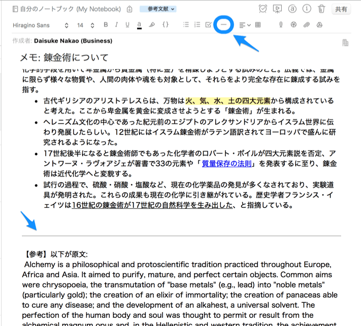 Evernote のノートには「ページ」という概念が無いため、ノートの縦方向の長さに関しては特に制限もありません。これを途中で区切りたい場合、書式バーの「―」ボタンをクリックすると、区切り線が挿入されます。とても単純な機能ですが、使い方次第でアイデアや情報の整理に役立つことがよくあります。