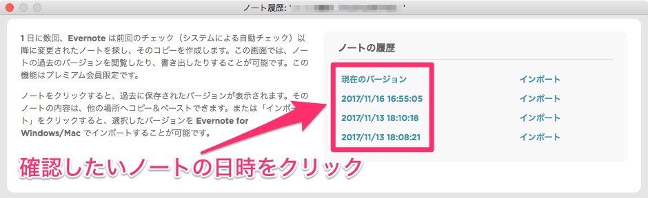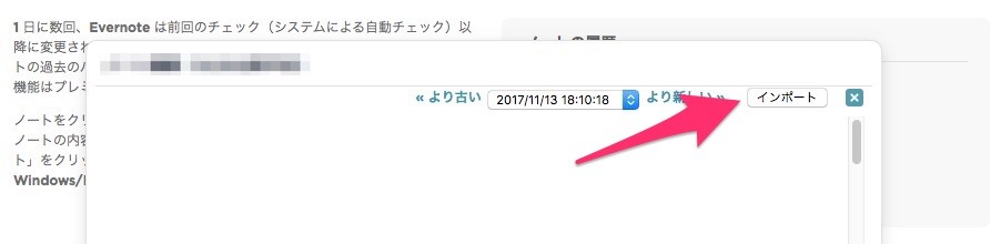 元の内容をコピーして今のノートにペーストすることもできますが、Mac 版・ Windows 版では、戻したいバージョンをそのままインポートする方法もあります。