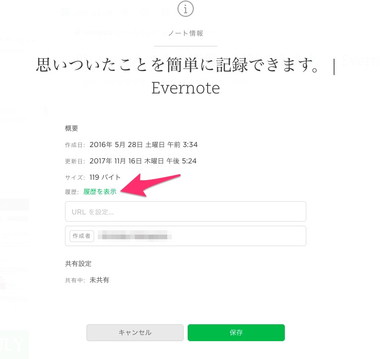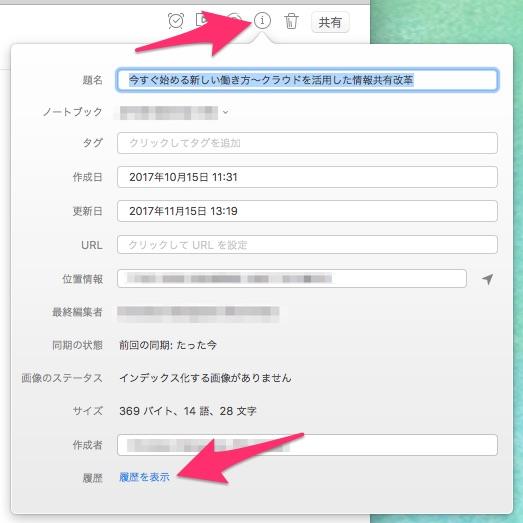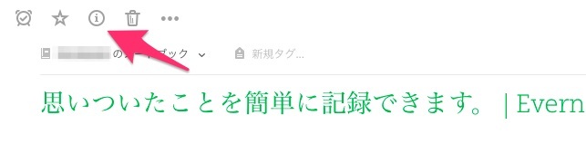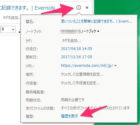 Mac 版、Windows 版、Web版の Evernote で履歴を確認したいノートを開き、ノート編集画面上部の「i」(情報)アイコンをクリックし、「履歴を表示」をクリックします。