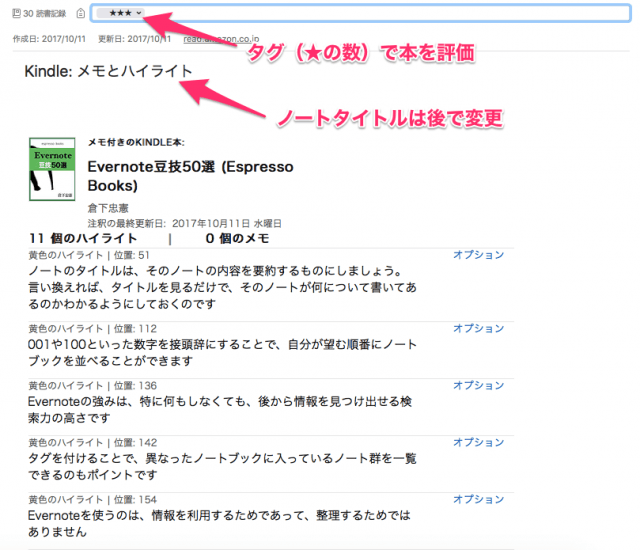 上記で保存したものは、Evernote ではこのように見えます。ノートタイトルを本のタイトルなどに変更したら、タグ(★の数)を使って本の評価を記録しておくのも良いでしょう。もちろん、感想文を残しておきたいという方は、メモを書き加えることも可能です。