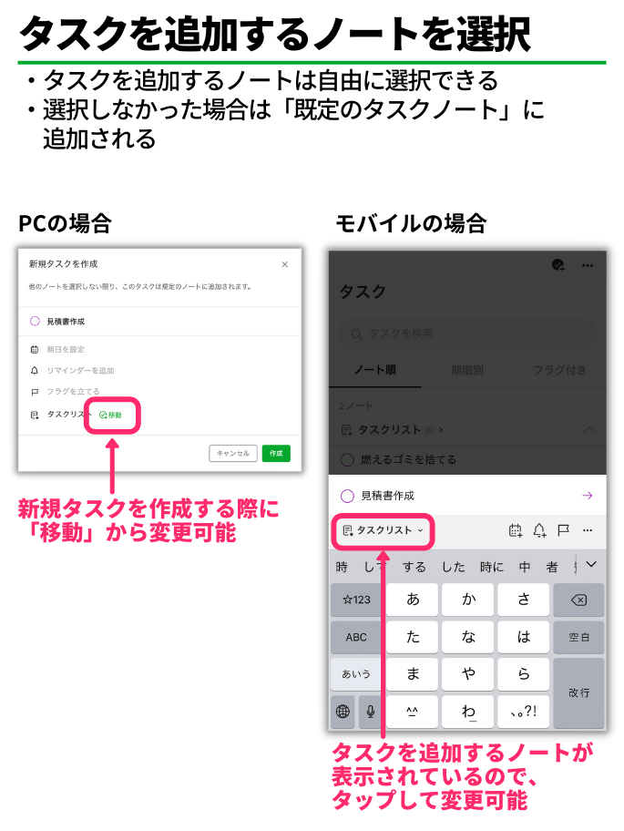 作成したタスクは、「1-2. タスクビューからタスクを作成する」と同様に、既定のタスクノートに登録するか、自分で別のノートを選んで登録するかを選択可能です。参考: タスクを作成する – Evernote ヘルプ&参考情報
