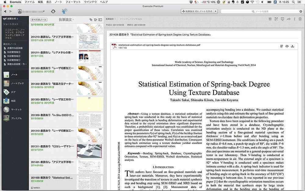酒井:まずは自分で執筆した論文の管理ですね。執筆した論文のすべてを PDF 形式にして Evernote に保存しています。論文集に掲載された論文は、通常は紙で 50 部のコピーが届きます。本来は打ち合わせなどで相手に渡して説明したりするのに使うのですが、これがとにかくかさばるんですよ(笑)。だったら PDF で送った方が早いですし、Evernote ノートのリンクを共有する方がいいですよね。