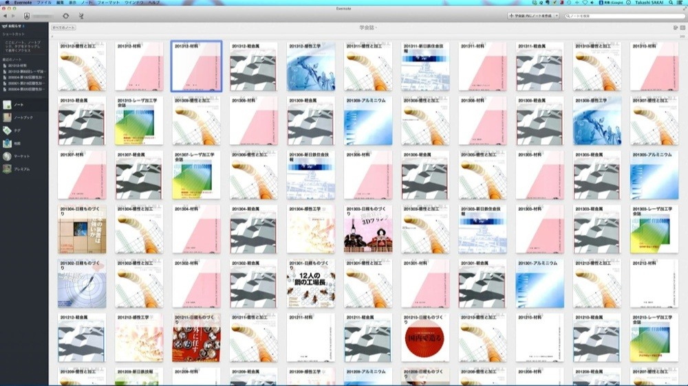学会誌は1ヶ月に4〜5冊ほど届くのですが、これをイメージスキャナで PDF 化して、Evernote に入れてしまいます。私自身は普段、MacBook を使っているのですが、個人用と研究室用のアカウントは簡単に切り替えができるので、特に面倒だと感じたことはありません。この試みは 5 年以上前から行っていて、当時から今までの学会誌がすべて入っている状態です。