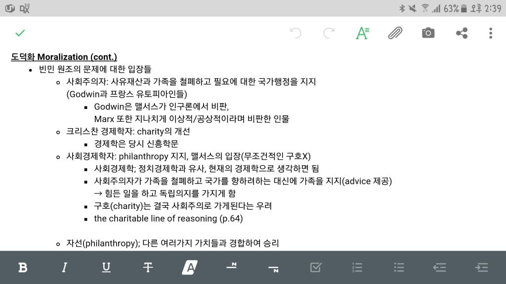 노트북이 무겁거나 데스크탑만 사용하시는 분들도 많으시죠? 저도 지금은 가벼운 노트북을 쓰고 있어서 그나마 나은데, 그 전에는 노트북이 무거워서 되도록이면 들고 다니지 않으려고 했습니다. 대신에 블루투스 키보드는 항상 가지고 다녔는데, 물론 노트북만큼 편하게는 아니지만 블루투스 키보드를 이용해서 어플로 필기를 해도 거의 동일한 편집기능을 활용할 수 있습니다.예전에는 이렇게 필기를 하면 너무 눈에 띄는 것 같기도 했는데, 이제는 꽤나 보편적으로 많이 사용하시는 방법인 것 같아요. 핸드폰 어플로 필기를 할 때 에버노트의 강점이 무엇이냐 한다면, 일단 깔끔한 편집화면도 있겠지만 무엇보다도 '동기화' 덕분에 필기를 잃어버리거나 중간에 갑자기 중단하거나 핸드폰을 끄더라도 유지된다는 점인 것 같습니다. 또, 어플로 필기를 하면 어플에서만 열람이 가능하거나, 혹은 PC프로그램/웹과 동기화 되더라도 다소 편집 모양이 다른 경우들이 있는데 에버노트는 그렇지 않다는 게 정말 맘에 들었습니다. 파일첨부나 문서카메라 사용 등도 바로바로 할 수 있으니 정말 편리했어요. 많이 사용하는 방법입니다 :)